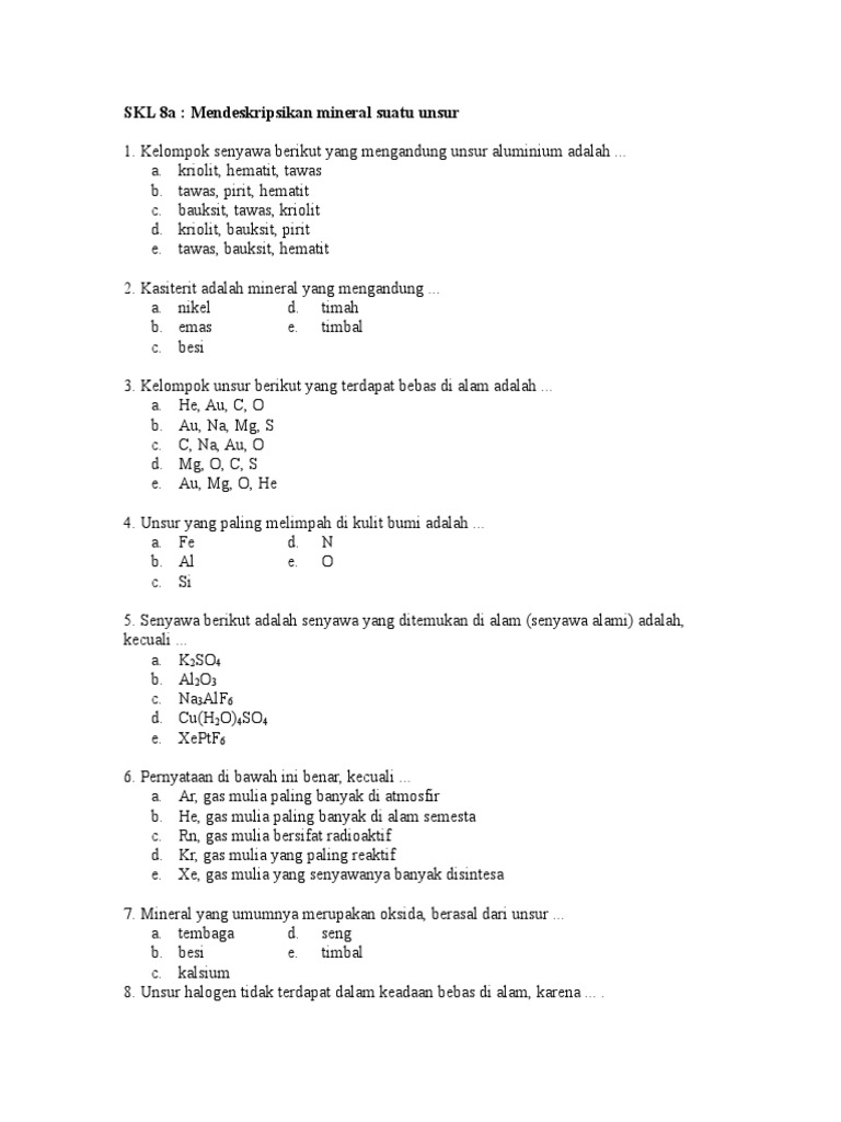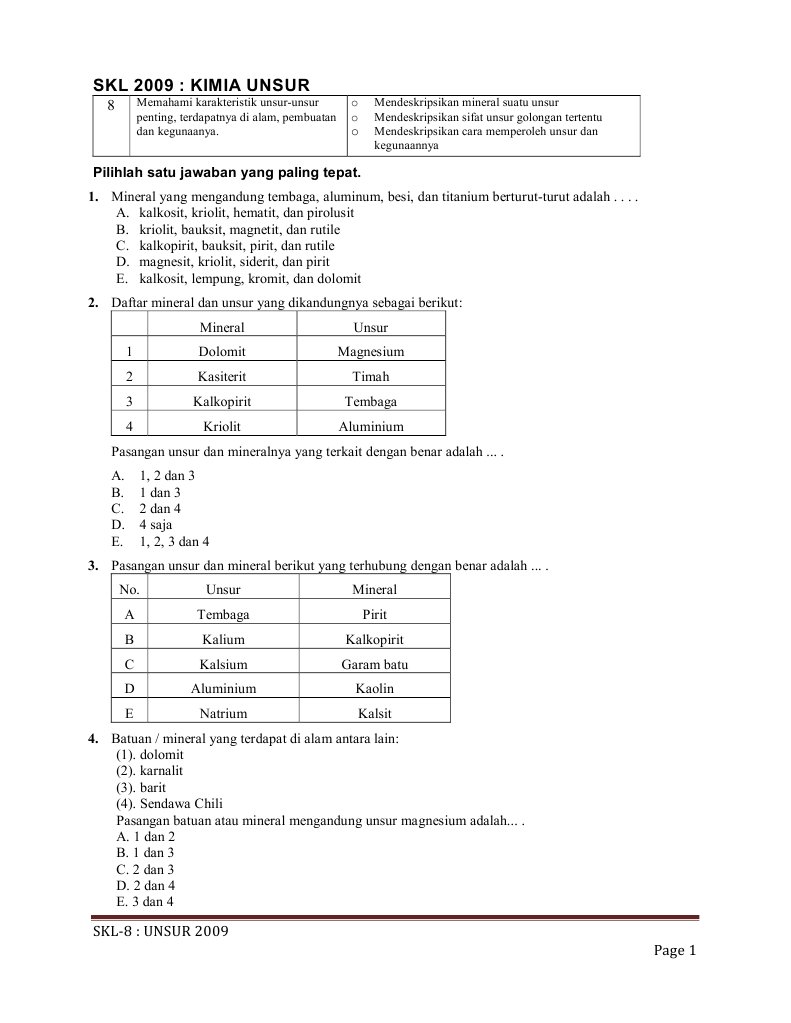 pasangan data yang tepat antara mineral dan unsurnya adalah nomor …
