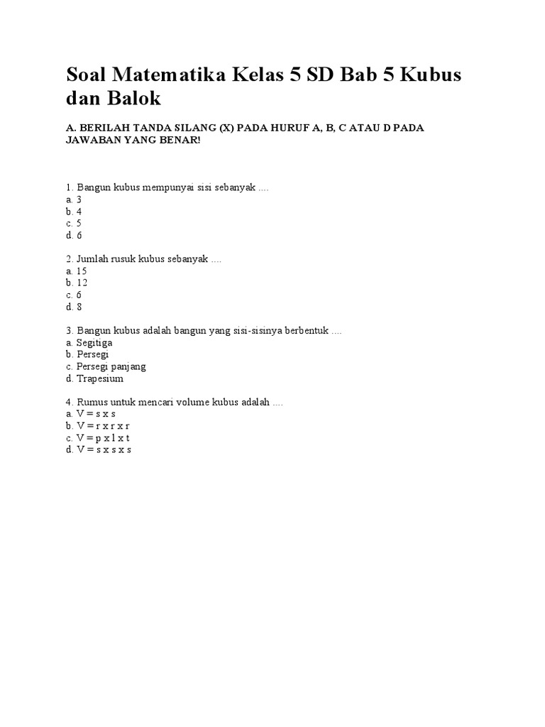 Soal Matematika Kelas 5 Sd Bab 5 Kubus Dan Balok - ProProfs Quiz